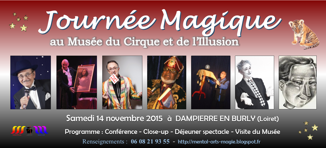 Amis Magiciens, Mentalistes, Circassiens et passionnés par les arts du spectacle, ne manquez pas la Journée Magique du 14 novembre 2015 organisée par l’association Mental Arts Magie de FAY AUX LOGES au Musée du Cirque et de l’Illusion à DAMPIERRE EN BURLY chez Rémy DEMANTES.
